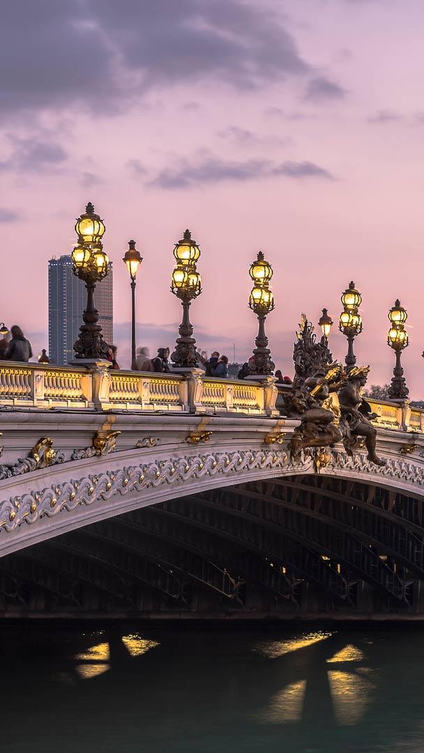 Bonjour! Waking up in Paris sounds royal, doesn"t it? Peek through your screen today at the Pont Alexandre III in the magic hour of twilight. Arching over the Seine, the bridge was opened in 1900 and named after the Russian tsar, Alexander III, to commemorate the Franco-Russian Alliance signed in 1891. Befitting the nobility of the event, two 17-metre pylons sit upon each bank of the river, crowned with gilt-bronze sculptures of the winged horse Pegasus. And that"s only at the start of the bridge! From the centre of the bridge, standing above reliefs decorated with nymphs, you can admire the romantic garden and monument of the Esplanade des Invalides on one side of the river and the Grand Palais and Petit Palais museums on the other.