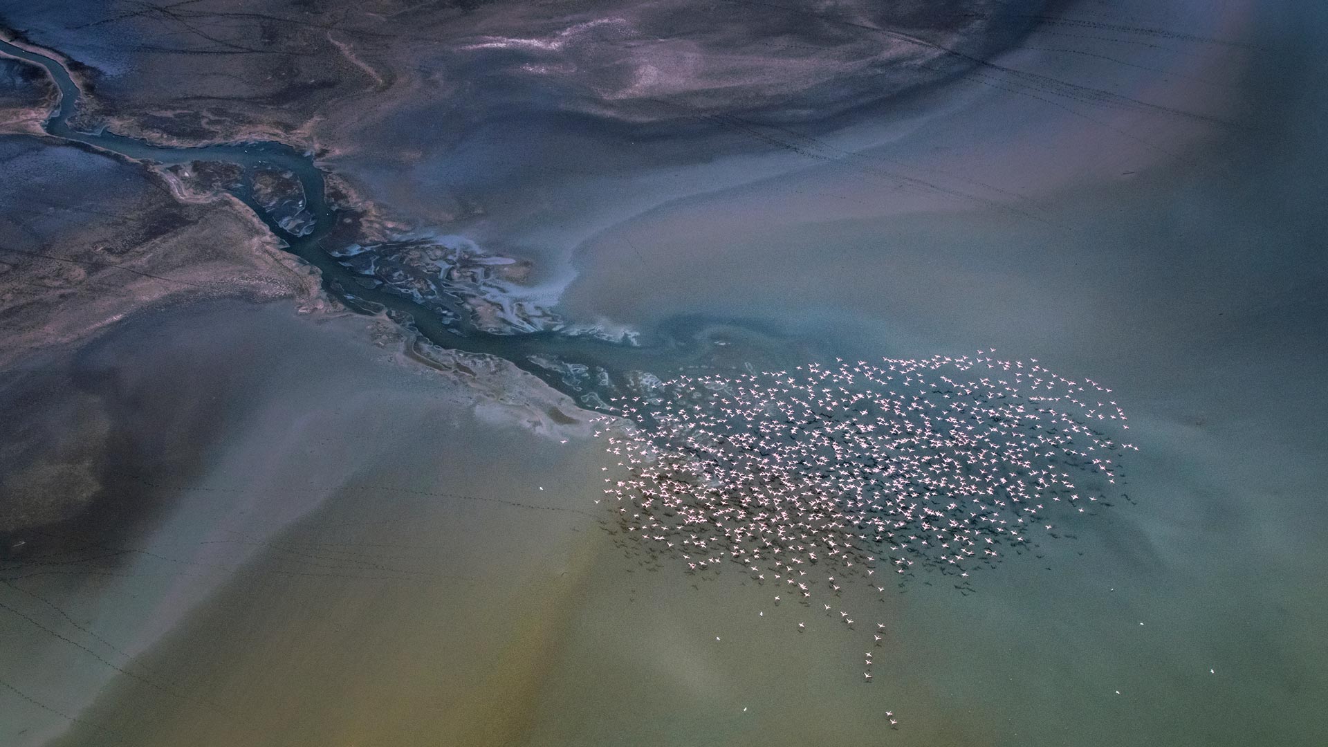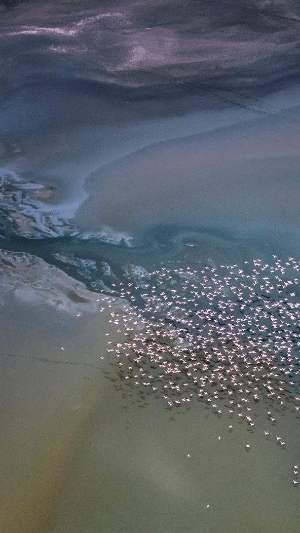This aerial photograph shows a flamboyance of lesser flamingos against the backdrop of Lake Magadi in Kenya. The lesser flamingo is one of the six species of flamingos and is known for its vibrant pink plumage and distinctive feeding behaviour. These birds prefer to eat near the surface of the water due to the way their beaks are built. They primarily inhabit African soda lakes that have a high carbonate concentration. Lake Magadi is one of the soda lakes that are brimming with cyanobacteria and algae, providing ample nourishment for the flamingos. The spectacle of thousands of these avian wonders congregating at the lake reveals the importance of these unique ecosystems.