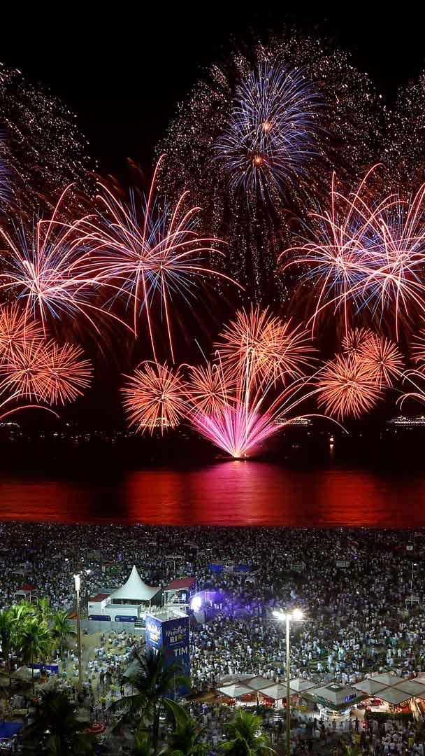 É meia-noite no Rio! Queima de fogos de Ano-Novo na Praia de Copacabana, Rio de Janeiro, Brasil (© Wagner Meier/Getty Images)