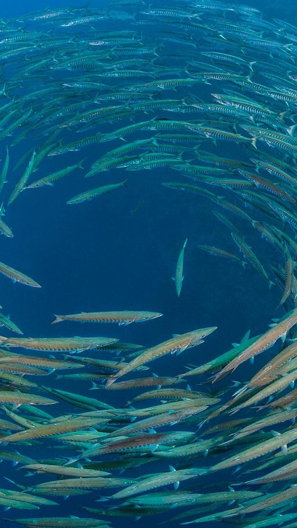 Brilho em sincronia Cardume de barracudas-de-barbatana-preta, Shark Reef, Parque Nacional Ras Mohammed, Península do Sinai, Egito (© Alex Mustard/Nature Picture Library)