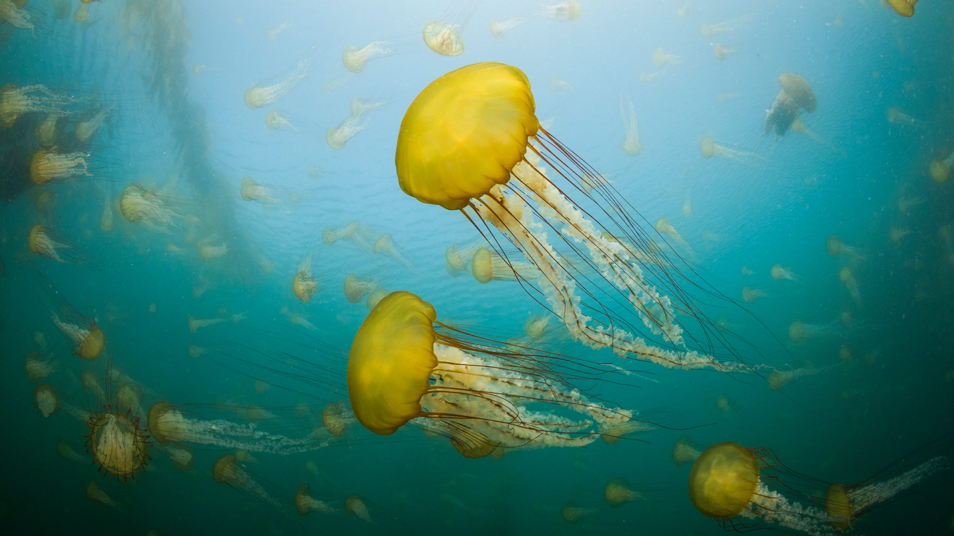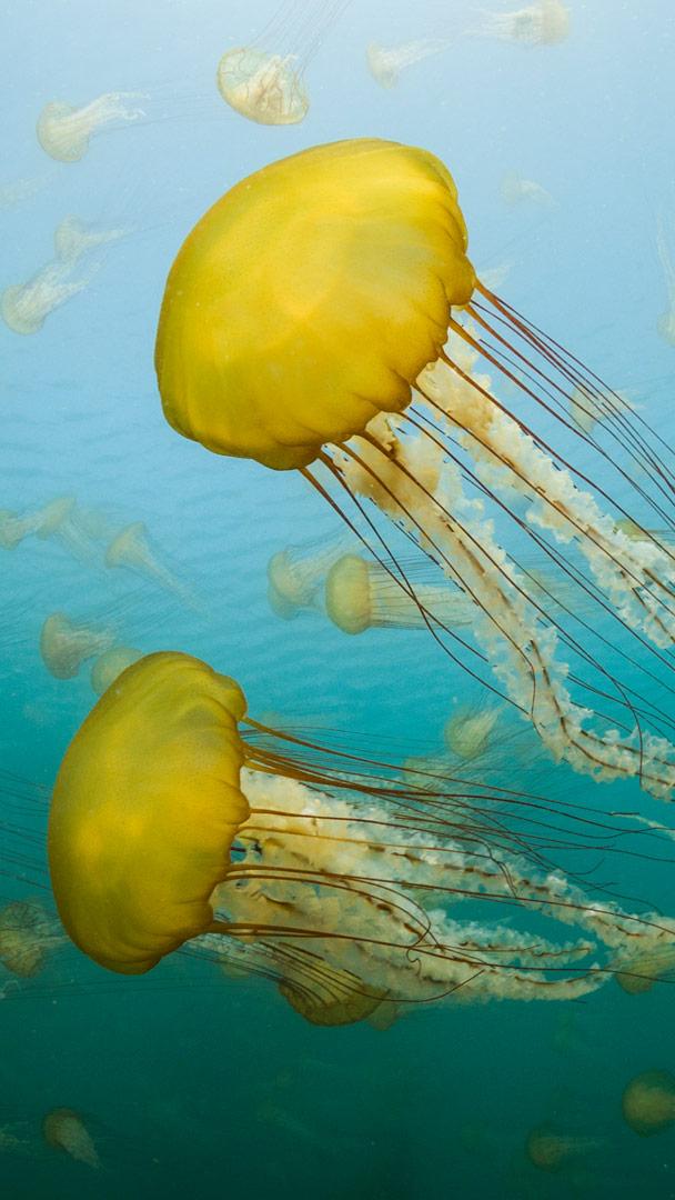 Uma floração iluminada Medusas-do-mar-do-Pacífico ao largo da costa de Carmel, Califórnia, EUA (© Jim Patterson/Tandem Stills + Motion)