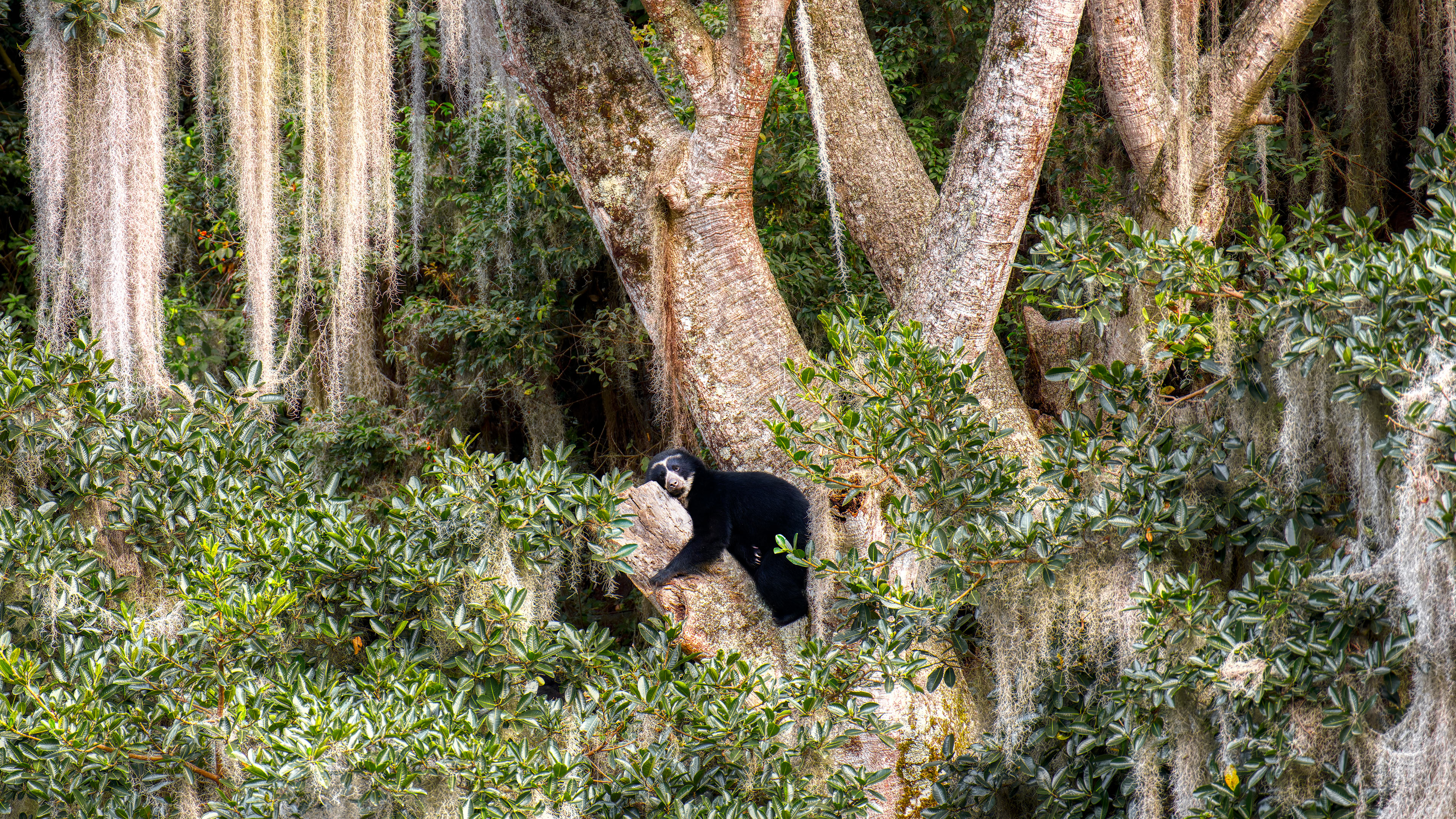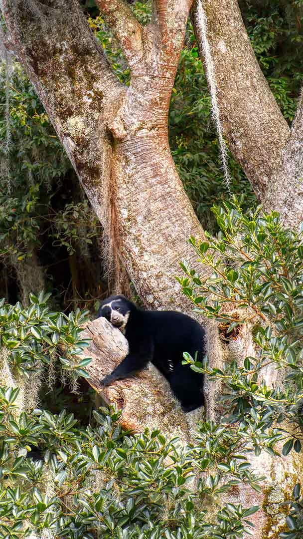 Spectacled bear resting in tree, Ecuador © Andy Rouse/Nature Picture Library