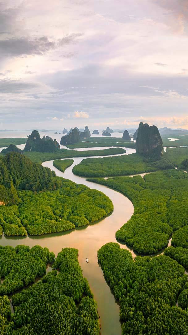 In the tropics, land greets sea warmly Mangrove forest in Phang Nga Bay, Andaman Sea, Thailand (© Ratnakorn Piyasirisorost/Getty Images)