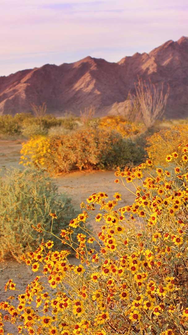 You know you"re in the Sonoran Desert, Arizona, in the US, when the sun gives you a warm "welcome"! This arid land is home to various animals such as roadrunners, Gila monsters and the Morafka"s tortoise. The Sonoran Desert experiences two rainy seasons, which leads to the blossoming of colourful wildflowers such as the brittlebush, seen in today"s image. These hardy shrubs seen here are adapted to the dry climate, with their silvery-grey leaves covered in fine hairs that help reduce water loss through transpiration.