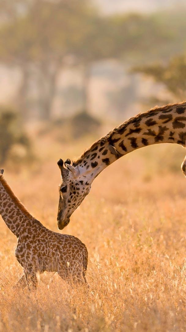 寻找斑点 一只马赛长颈鹿妈妈正在给小长颈鹿梳理毛发, 塞伦盖蒂,坦桑尼亚 (© Alberto Cassani/Getty Images)