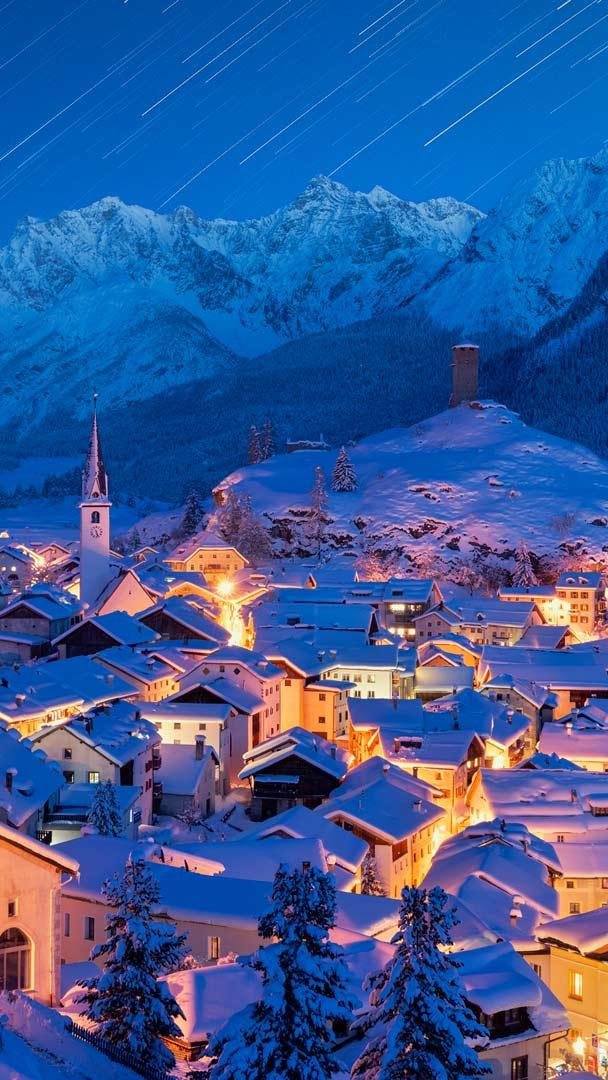 熠熠生辉的村庄 阿尔德兹村上空的星轨,格劳宾登州,瑞士 (© Roberto Moiola/Getty Images)