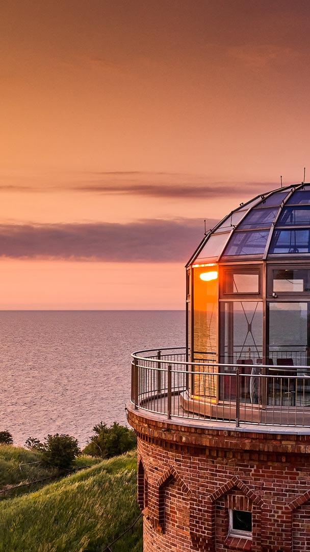 Über der Nordspitze Rügens liegt am Kap Arkona warmes Abendlicht über Backstein und Glas. Der Peilturm mit seiner markanten Kuppel erhebt sich über die sanft geschwungenen Klippen und fängt die letzten Farben des Himmels ein. Unter ihm fällt die Steilküste bis zu rund 43 Meter zur Ostsee ab, die sich ruhig bis zum Horizont erstreckt.