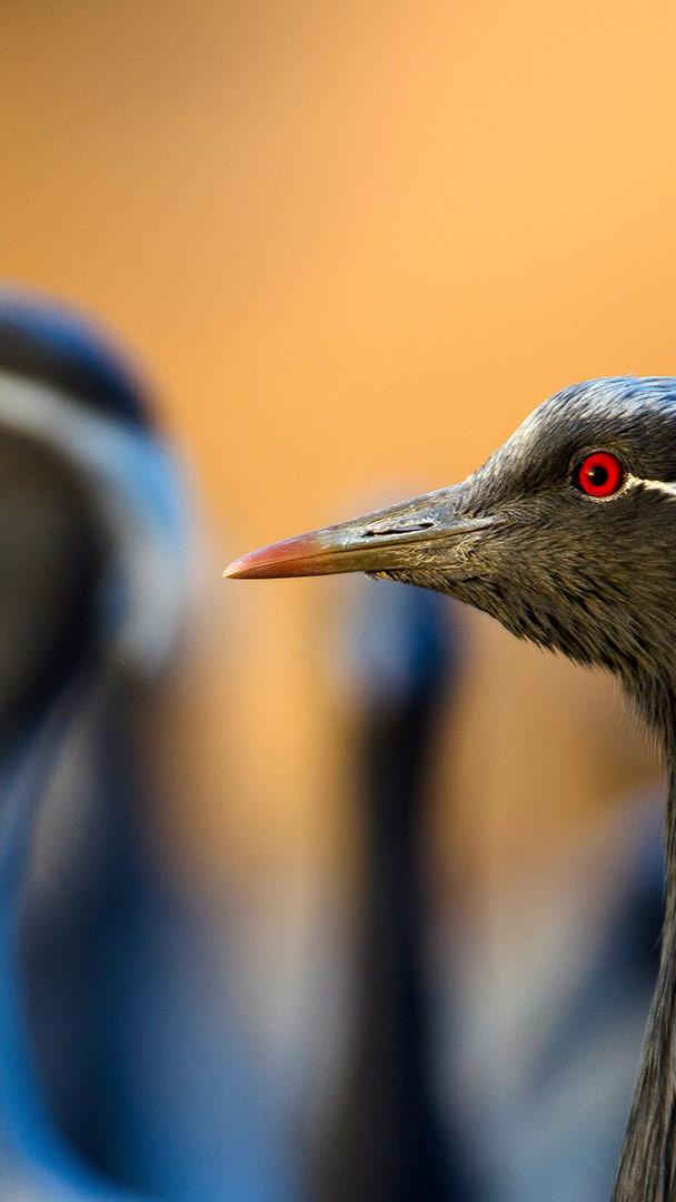 Schon seine Silhouette verrät, warum der Jungfernkranich als einer der elegantesten Kraniche gilt. Mit seinem schlanken Hals, den langen Beinen und dem fein gezeichneten Gefieder wirkt er beinahe schwerelos, besonders im warmen Licht der Abendsonne. Eindrucksvoll sind auch seine geschmeidigen Balztänze, bei denen sich die Paare in synchronen Sprüngen und Rufen präsentieren. Obwohl er zu den kleinsten Kranichen der Welt zählt, legt er erstaunliche Distanzen zurück: Von den weiten Steppen Kasachstans zieht er zu seinen Winterquartieren in Indien, Nepal und Teilen Afrikas.