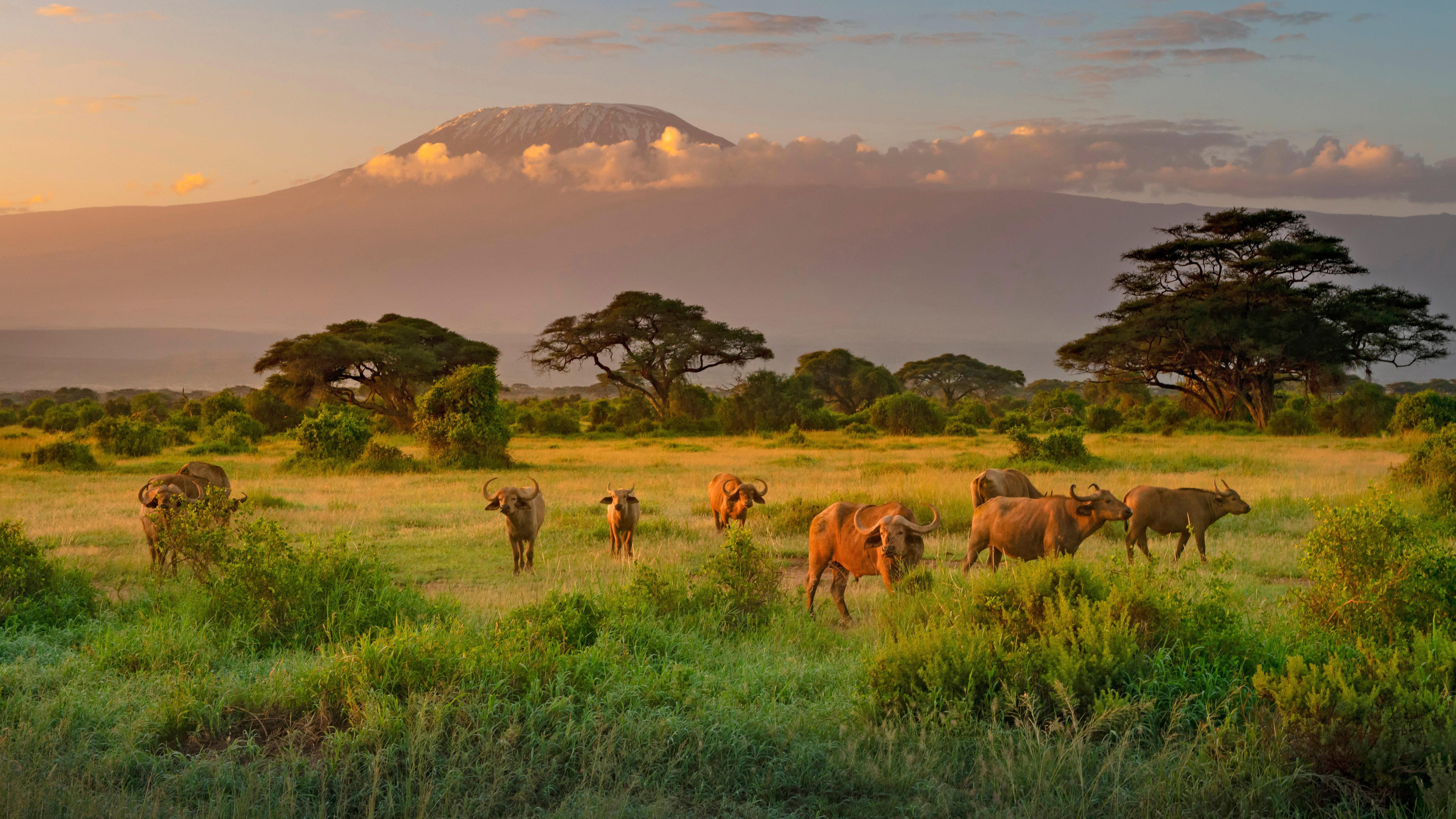 Ein Experiment in Sachen Nachhaltigkeit Kilimandscharo mit Kaffernbüffeln im Vordergrund, Amboseli-Biosphärenreservat, Kenia (© RealityImages/Shutterstock)