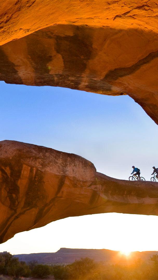 Nicht nach unten sehen! Radfahrer auf einem natürlichen Felsbogen in der Wüste bei Moab, Utah, USA (© Whit Richardson/Cavan)