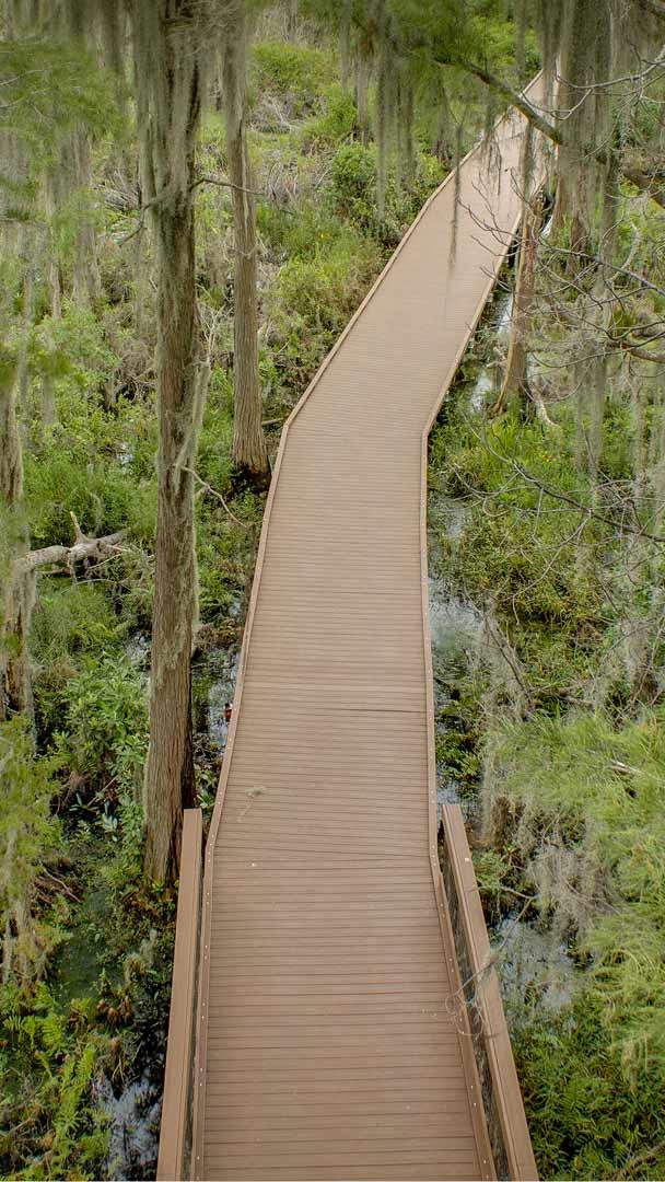 Wagen Sie es, in diesen dichten Sumpf einzutauchen? Bäume mit Spanischem Moos über der Uferpromenade im Okefenokee-Sumpf, Georgia, USA (© Emmer Photo/Alamy)