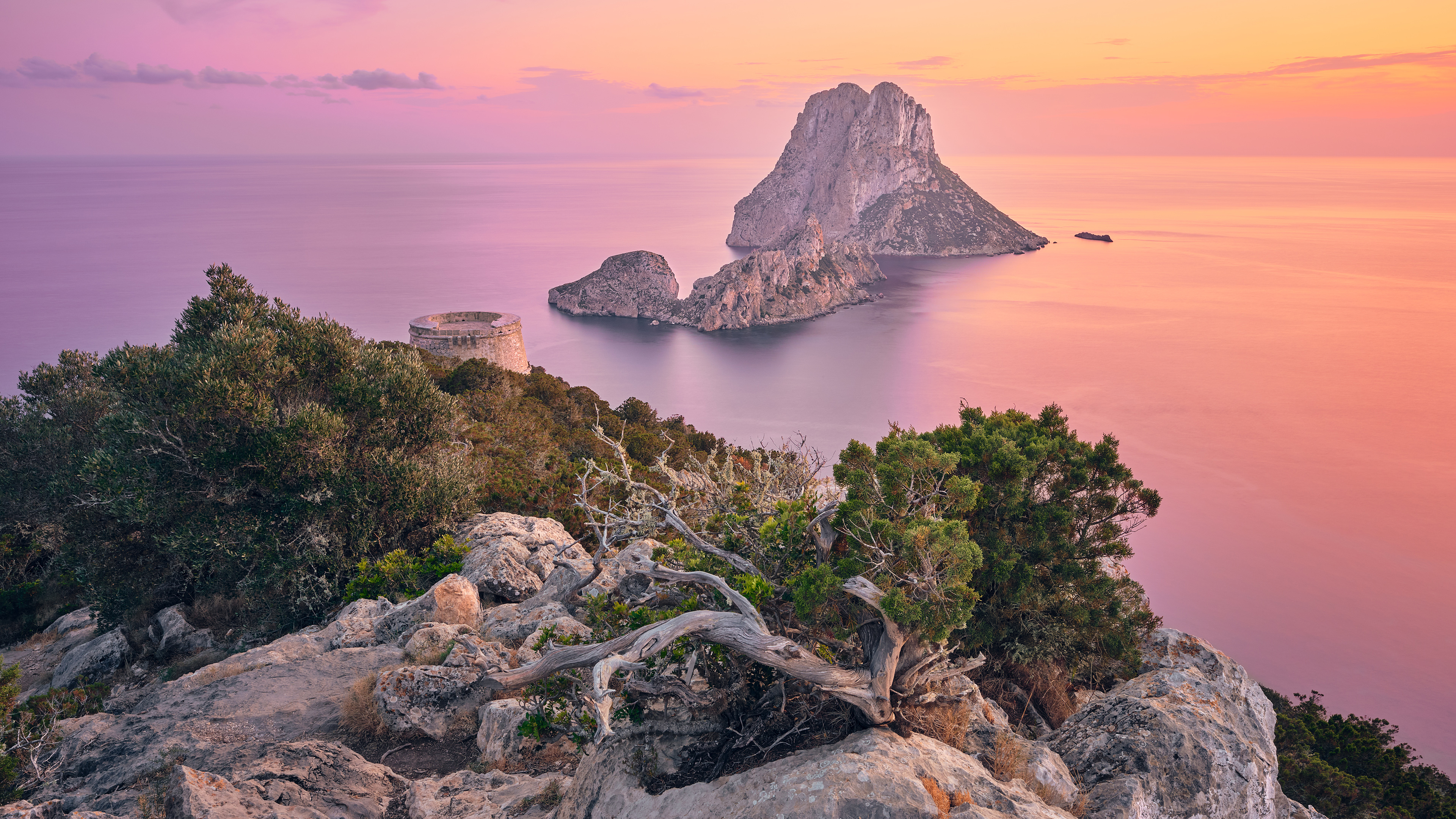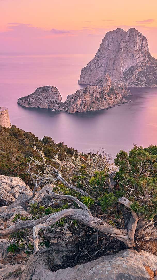 Au sud-ouest d’Ibiza (Espagne), les îlots inhabités d’Es Vedrà et d’Es Vedranell surgissent de la Méditerranée comme deux géants minéraux. Classés « réserve naturelle », leurs reliefs abrupts — dont les falaises d’Es Vedrà qui s’élèvent à près de 400 mètres — évoquent une silhouette presque montagneuse au cœur de la mer. La silhouette irrégulière d’Es Vedranell, surnommée le « dragon endormi », semble veiller sur son imposant voisin. Le duo évoque ces promontoires rocheux de Corse qui, au crépuscule, semblent animés d’histoires anciennes.