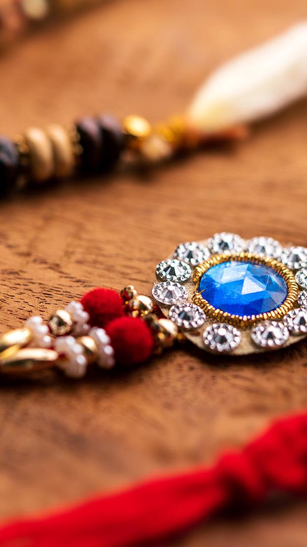 An unbreakable bond between siblings Handmade threads (rakhis) kept on a wooden surface (© Avijit Sadhu/iStock/Getty Images Plus)