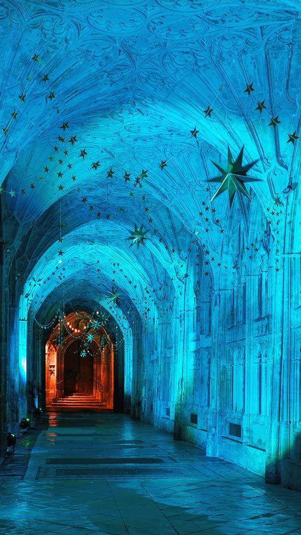 Christmas in the cloister Christmas decorations in the medieval cloister at Gloucester Cathedral (© PJ Photography/Shutterstock)