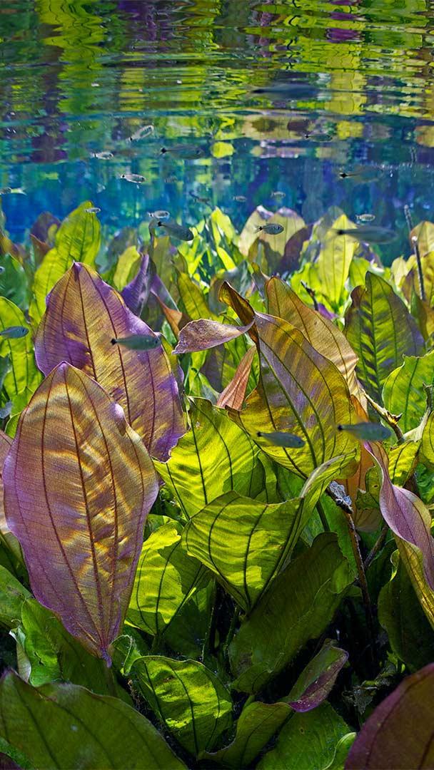 Crystal clear Underwater river scene with freshwater plants and tetra fish, Aquário Natural, Rio Baia Bonito, Mato Grosso do Sul, Brazil (© Michel Roggo/Minden Pictures)