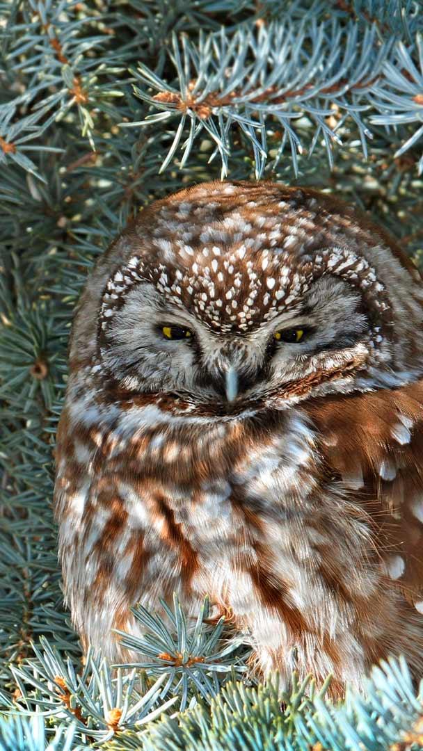 In North America"s coniferous forests lives a tiny bird of prey—the boreal owl. The small, brown, and white flecked raptor is shy and evasive around humans, keeping it well hidden from our view. Despite its compact size, it is a formidable hunter, feeding on small mammals, voles and birds. They have a preference for dense forest environments but are known for their adaptability and have been observed in various habitats, including mountainous regions. With dark plumage and expressive eyes, it strikes a captivating figure in the moonlit canopy, intriguing bird enthusiasts and researchers.