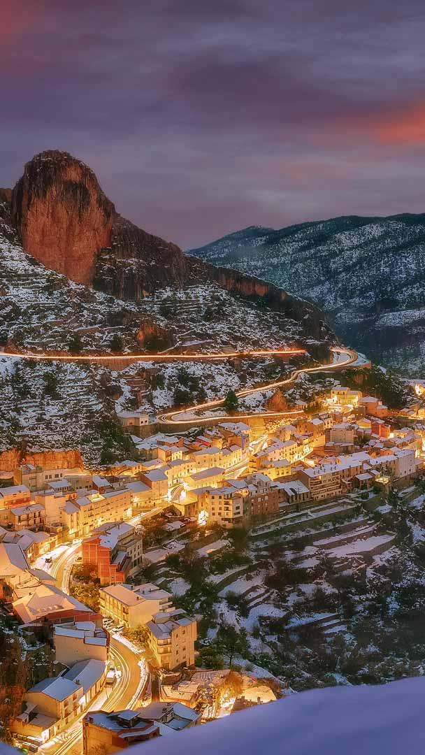 Snow might not be the first thing that pops into your mind when thinking about Spain, but thanks to its diverse landscapes from high peaks and warm beaches, Spain has it all. Featured in today"s image, the tiny village of Aýna—with a population of less than 1,000—lies in the steep valley carved by the river Mundo in the Sierra del Segura mountain range. Because of its snow-capped mountains during the winter months, the town is frequently called Manchegan Switzerland—with "Manchegan" referring to the autonomous community of Castile-La Mancha that Aýna is a part of. About 150 miles south of the capital, Madrid, Aýna offers a unique glimpse into Spanish village life.