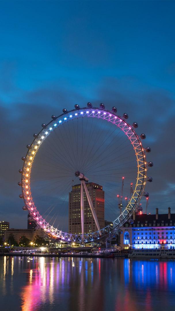 Rainbow reflection London Eye illuminated at dawn, England (© Pajor Pawel/Shutterstock)
