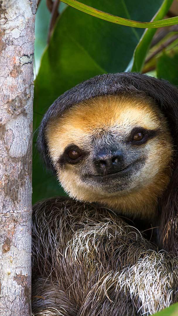 We hate to break it to you, but the affable grin on this pale-throated sloth is probably not due to its laid-back lifestyle. Our adorable tree hugger looks content thanks to its facial mask and the natural shape of its mouth. Spotting one of these slow-moving solitary animals takes a little skill. The thick outer layer of a sloth"s coat is an ideal growing medium for green algae, which forms a natural camouflage in the canopy of tropical forests here in northern South America. If you do spot a pale-throated sloth it will likely be enjoying a simple meal of leaves, limbs, and tree buds. Because sloths don"t have incisors, they spend most of their waking hours smacking their lips together "to chew" their food. This would drive most animals to starvation (if not culinary madness), but the sloth"s metabolism is so slow that it"s evolved to survive on less food.