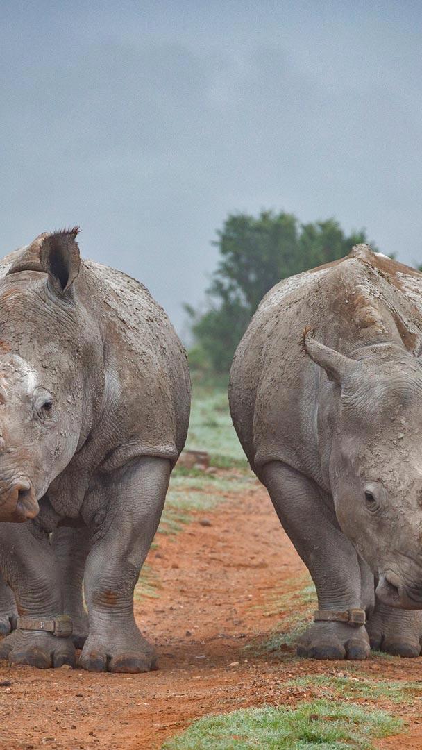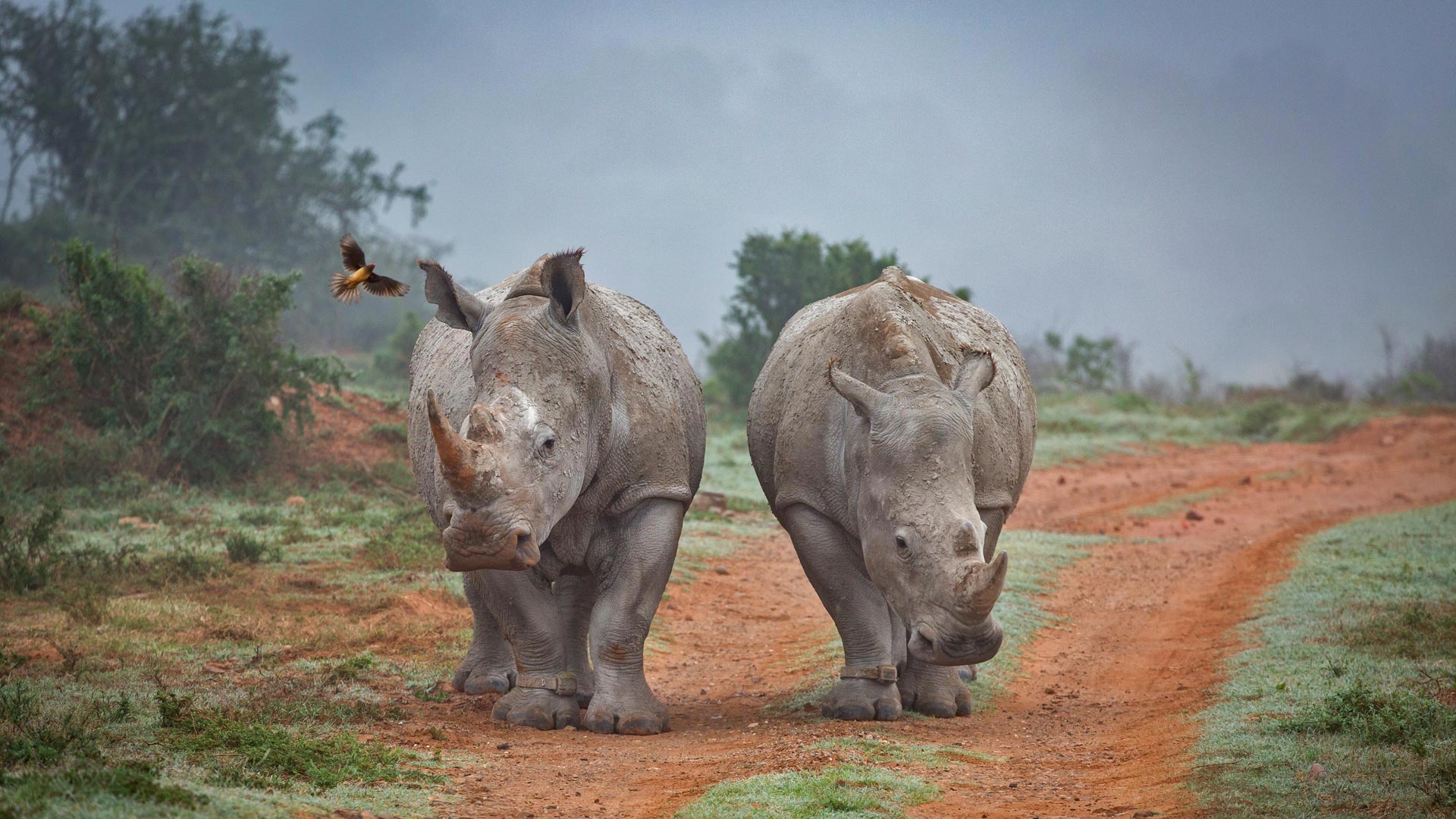 In honor of Wildlife Conservation Day, we"re looking at these two white rhinos strolling through the Amakhala Game Reserve in South Africa—with a friendly oxpecker bird on their tails. The large anklets they"re wearing are used to track the endangered animals and protect them from poaching. Both white and black rhinos live in open savanna, but the adult rhinos" only real predators are humans who hunt them for the illegal trade of their horns. Although they are known for being large, tough animals, rhinos are easily poached during their daily visits to the watering hole. Southern white rhinos now thrive in protected sanctuaries like the Amakhala Game Reserve. But the northern white rhino subspecies is believed to be extinct in the wild with only a few captive individuals remaining. Black rhinos have doubled from their low point over the past two decades, but still number only a fraction of their population in the early 20th century.