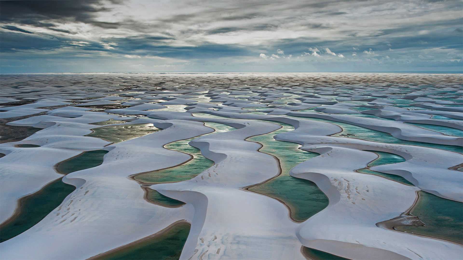 From the air, the mesmerizing tapestry of sandy dunes and lagoons you see here gives Lençóis Maranhenses National Park an otherworldly, desert-like appearance. Located in the sparsely populated northeast corner of Brazil, this park gets far too much annual rainfall—nearly 50 inches—to be considered a desert. In fact, heavy rain is part of what makes this place unique: Nearly 70% of its annual rainfall comes between January and May, filling the park"s nearly 40,000 lagoons to the brim with fresh rainwater. Why doesn"t the water sink into the sand? A layer of impermeable bedrock beneath the dunes prevents that from happening.