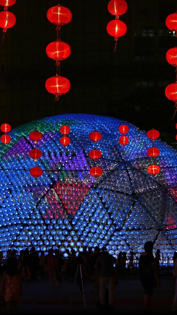 This photo takes us to Hong Kong"s Victoria Park, where a group of engineers constructed a giant lantern sculpture called "Rising Moon." It"s made of more than 7,000 recycled plastic water bottles with LED lights inside, to honor one of China"s most important holidays, the Mid-Autumn Festival. While it"s only been an "official" public holiday in China since 2008, mention of the Mid-Autumn Festival first appeared in written historical texts as far back as 3,000 years ago. Families celebrate the holiday by lighting paper lanterns and sharing a meal, traditionally at a round table. This reunion is said to bring good luck and happiness.