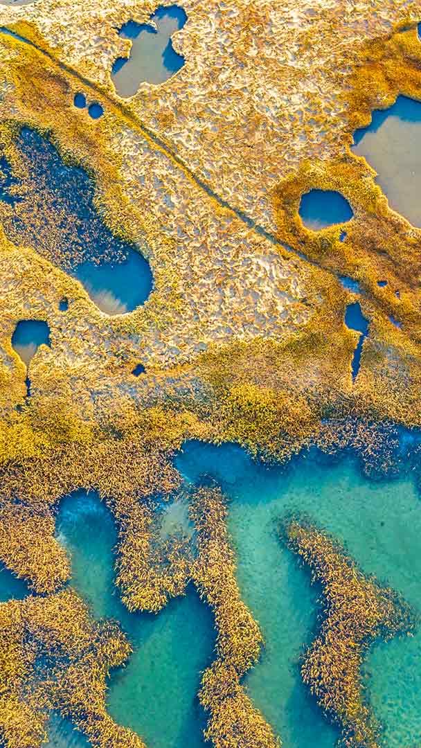 Lit by bright New England sunshine, the salt-tolerant grass growing here really stands out against the turquoise sea water lapping against it. Salt marshes are important coastal wetlands that protect shorelines from erosion, are major contributors to the aquatic food web, and provide nurseries for birds, fish, and other wildlife.