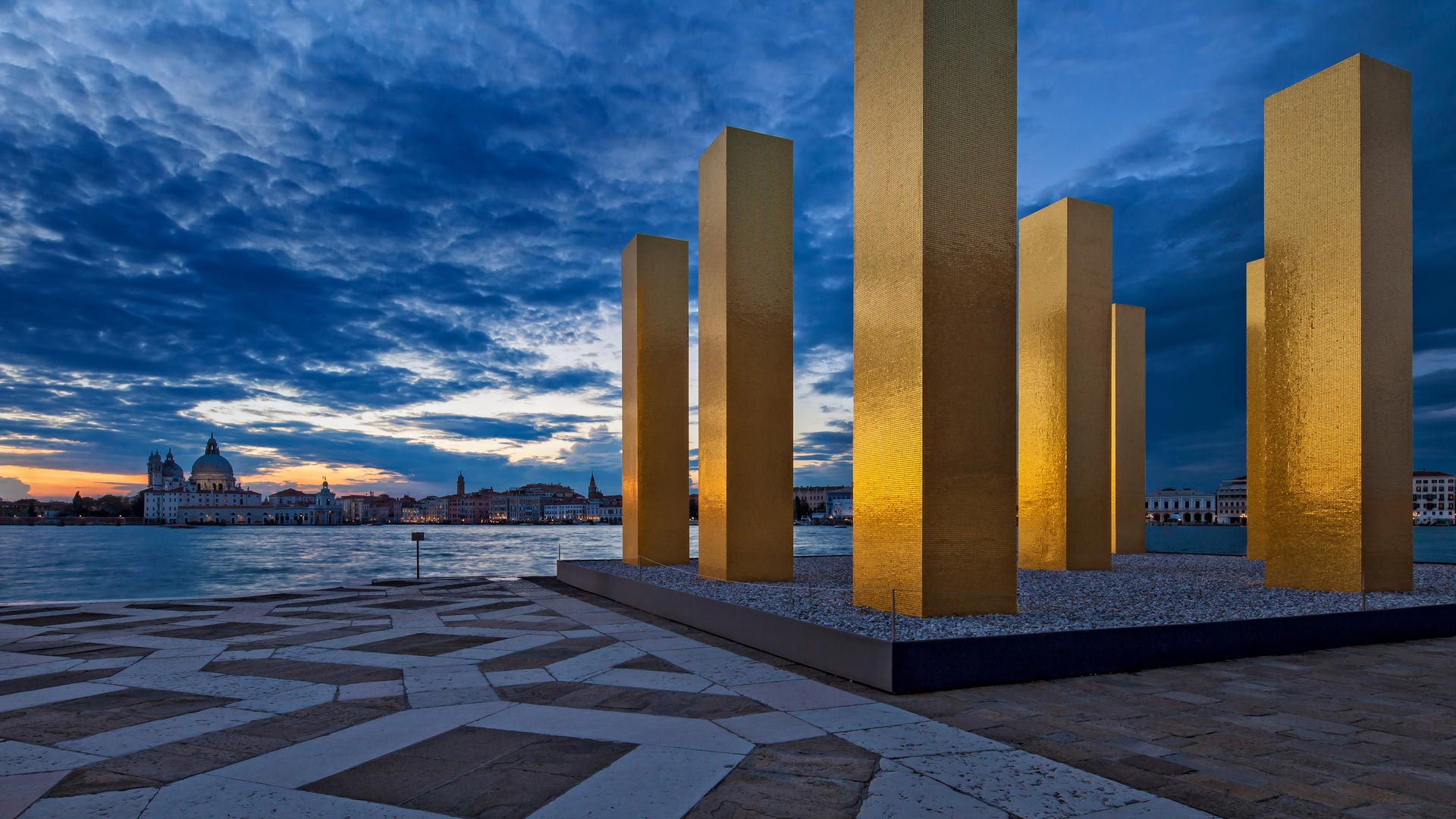 Here in the canal city of Venice, sun and water reflect off artist Heinz Mack’s sculpture called The Sky Over Nine Columns. The piece was on display here in on the island of San Giorgio Magiorre in 2014, during the Venice Architecture Biennale, and later traveled to Istanbul and Valencia. Visitors are encouraged to wander through the pillars as if wandering through a temple connecting the Earth to the sky. A closer look reveals the massive pillars are covered in 850,000 mosaic tiles coated in 24-carat gold leaf.