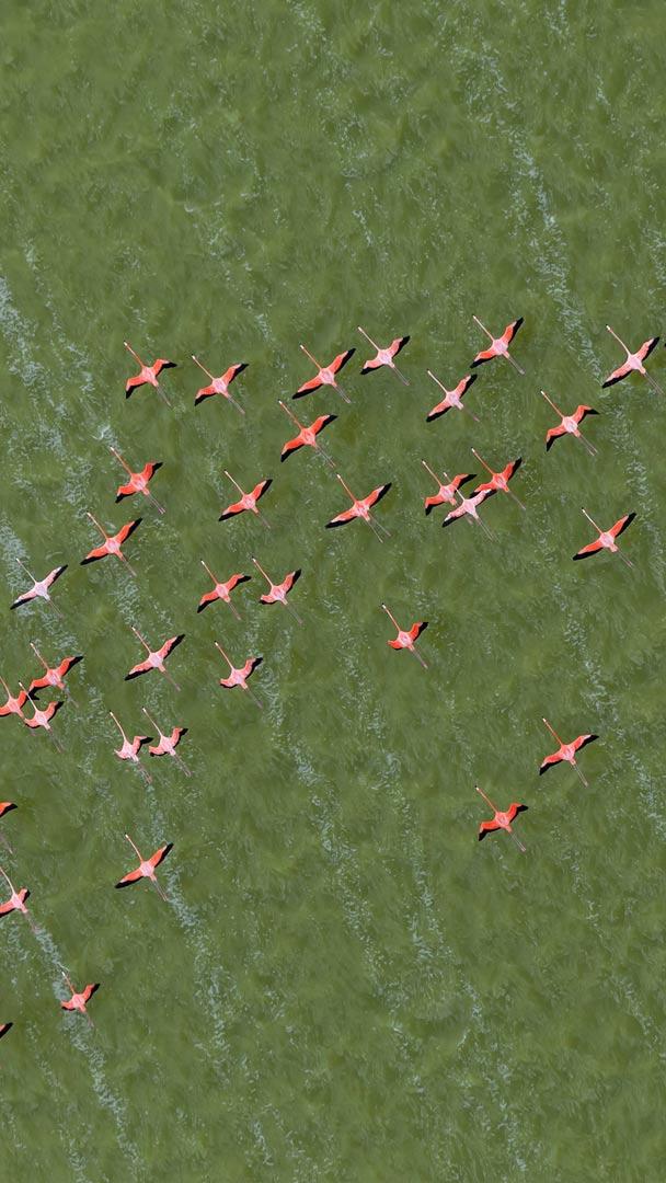 Ever seen a group of flamingos take to the skies? If you have, there"s a good chance they were Caribbean flamingos, also known as American flamingos, as seen in Yucatán Peninsula, Mexico, in today"s image. Flamingos are referred to as a flamboyance when in a group, but they can also be called a stand, colony, or pat. The Caribbean flamingo is the largest flamingo species in the Americas and the only one native to North America. These vibrant birds are typically found around brackish and saltwater areas, like marshes, estuaries, and along coastlines. Because of their pink color, they"re often confused with roseate spoonbills. However, their long necks and bent bills distinguish them from other wading birds like the great blue heron and wood stork.